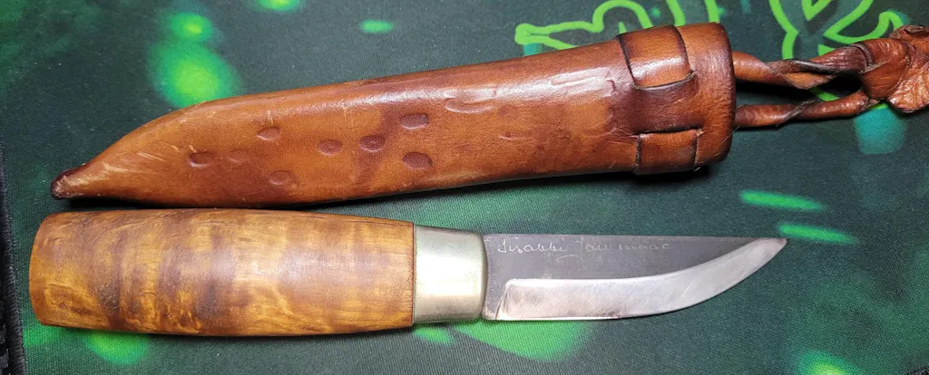 The blade is made of carbon steel. The sides are left black for a rustic look. The tang extends the full length of the handle. The handle is curly birch, with a girth suitable for average or slightly larger hands. The traditional leather sheath hangs from a twisted thong, and can be used for either left or right handed carry.