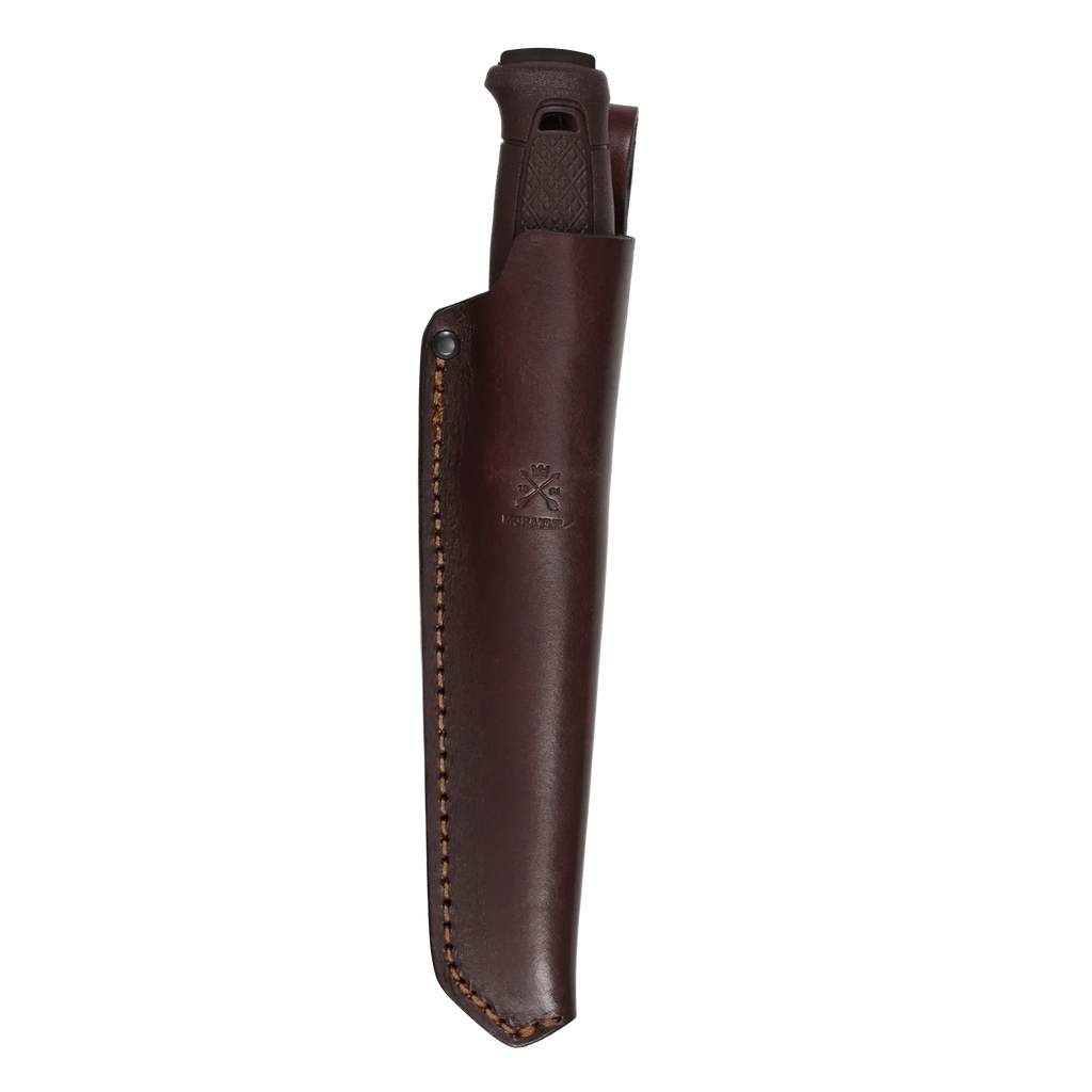 The dark brown handle is ergonomically shaped with a Dala-pattern friction grip and finger guard, ensuring a firm grip in any weather. The knife comes with a vegetable-tanned European leather sheath in matching brown, equipped with a practical belt loop.